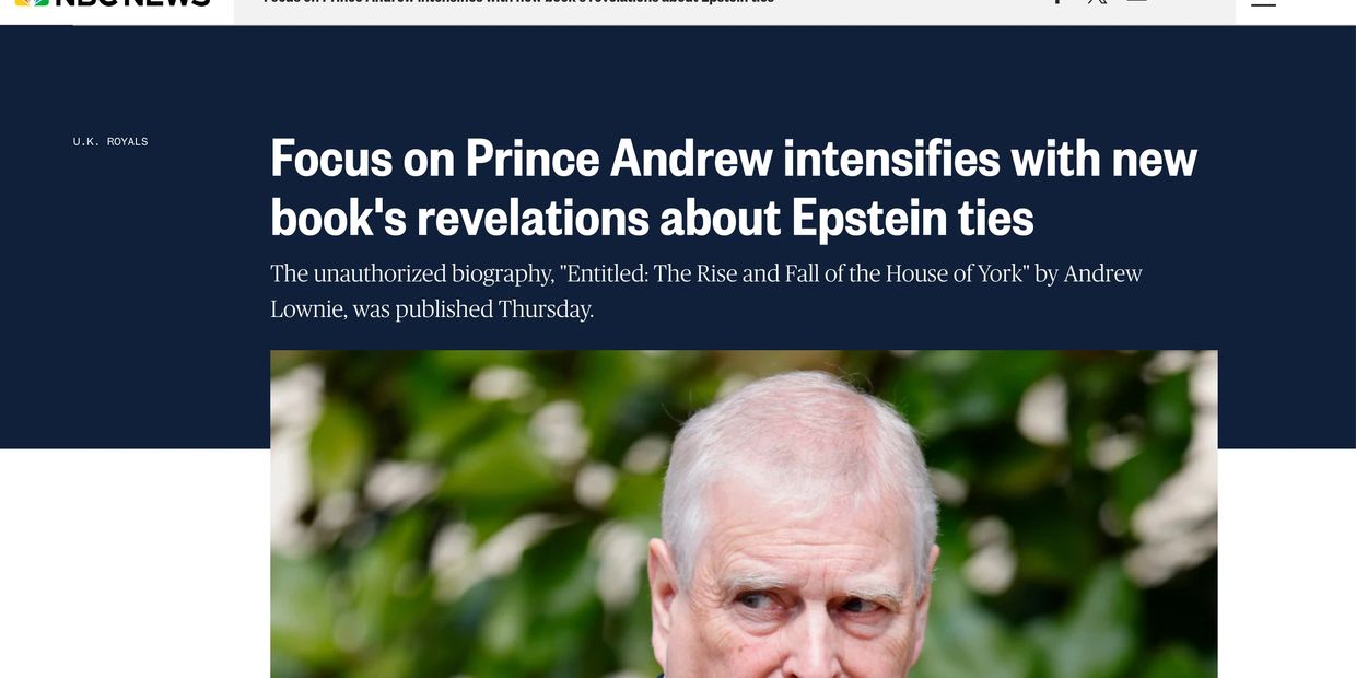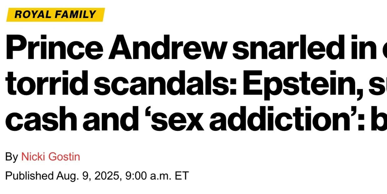 9/08/2025 - "An astonishing new book about Prince Andrew contains a series of eye-popping revelations about his life, from scandalous sex romps to his ill-advised friendship with Jeffrey Epstein" - NY Post